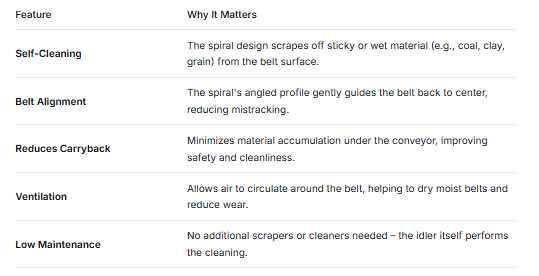 Carryback that drops from the return belt often accumulates beneath conveyors, creating housekeeping and safety concerns. The spiral return idler is designed to minimize material accumulation by reducing what remains attached to the belt on the return side. Cleaner return belts typically translate into less spillage and fewer cleanup tasks around the conveyor structure.